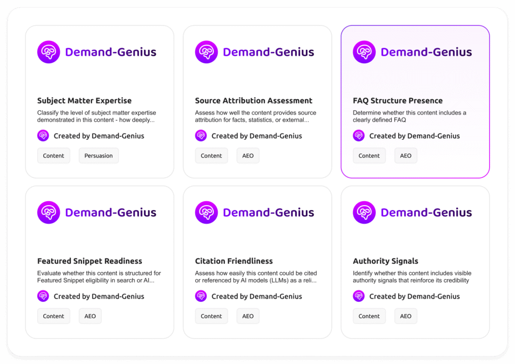 Most AEO tools count citations. Demand-Genius shows you how your brand is shaping the conversations where categories are won and lost — before a single citation is generated.