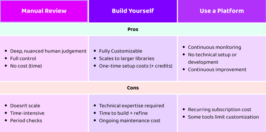 Do it manually: Assign team members to read and audit content. This doesn’t scale past small libraries and is hard to maintain as a discipline.