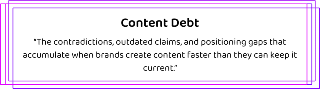 Content debt degrades user experience, suppresses SEO performance, wastes operational time, and increases legal/compliance risk. In the AI era, though, it carries a more significant cost and can do real damage to your brand’s visibility in and influence over AI responses.