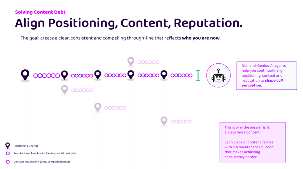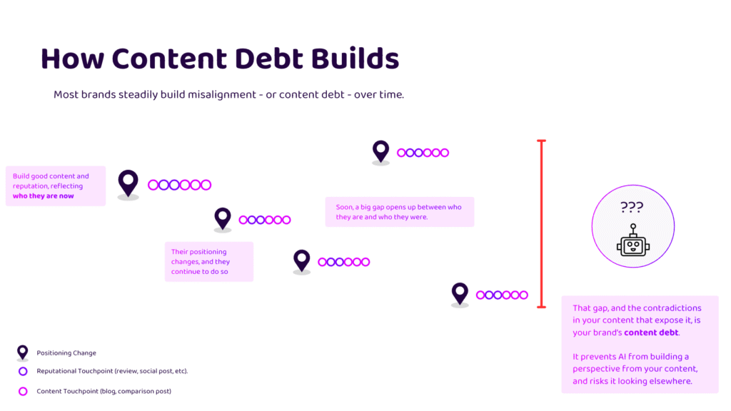 As brands evolve their positioning over time, they create new content and reputational touchpoints (reviews, etc) that align with that positioning. The challenge is that most brands have now done this over the course of 5, 10 or 20 years. With each evolution, a gap opens up between who you are and who you were. In that gap lies contradictions, and that is your content debt.