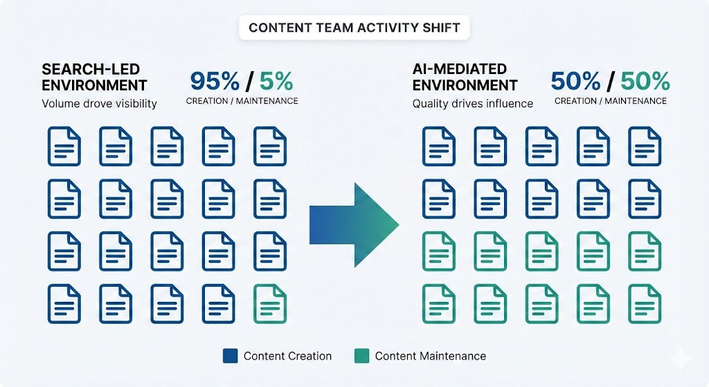Most content teams operate on a 95/5 split: 95% of effort goes to creating new content, 5% goes to maintaining existing content. This worked in a search-led environment where volume drove visibility. In an AI-mediated environment, your team’s split should be closer to 50/50. Half your effort creates new content. Half maintains, updates, and improves what already exists.