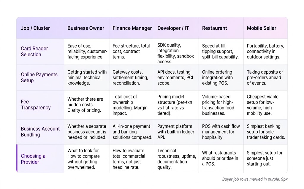 There are different ways to organise intent clusters. Some companies group them by product line. Others by audience segment or vertical. What we tend to see work best, particularly for B2B brands with complex buying journeys, is mapping clusters to jobs to be done (JTBD).