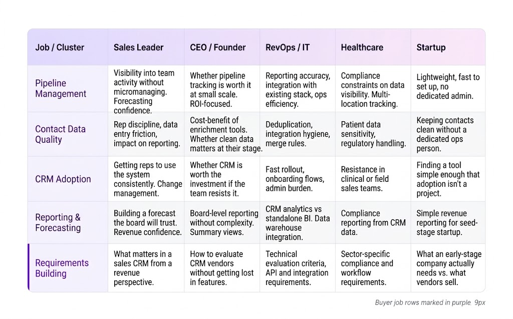 Rows are your jobs. Columns are the key variables that change how that job gets framed: personas, verticals, company stages, product tiers.